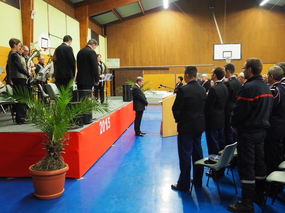 L'assemblé invitée aux voeux 2015 du maire de Waldighoffen observe une minute de silence pour les victimes des attentats terroristes des 7 et 8 janvier 2015.