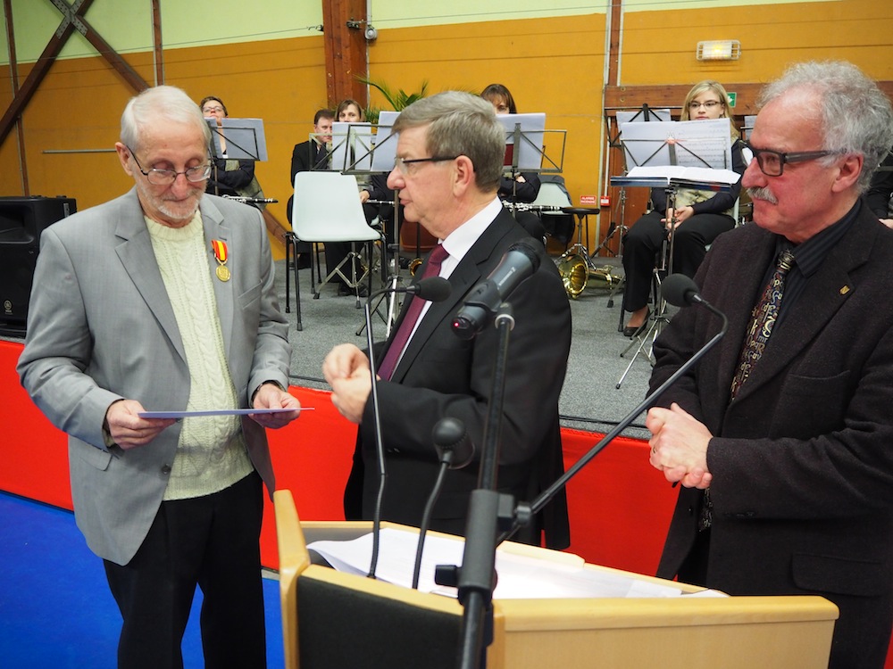 M. Dugardin reçoit un diplôme des mains du maire de Waldighoffen, après avoir reçu la médaille départementale du bénévolat.