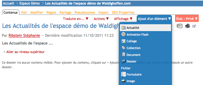 Copie d'écran pour montrer comment ajouter une Actualité dans son espace.