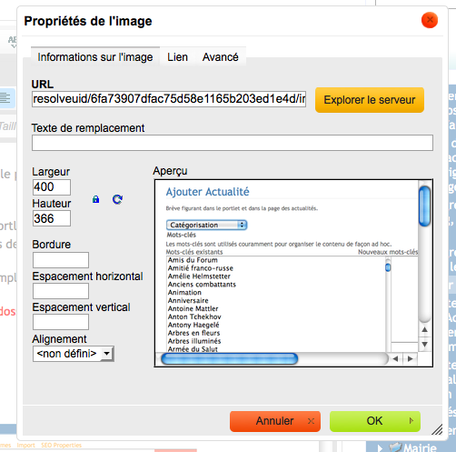 Visuel de la fenêtre "Propriétés de l'image" une fois le choix de l'image effectué, étape de l'ajout d'une image dans un contenu du site waldighoffen.com