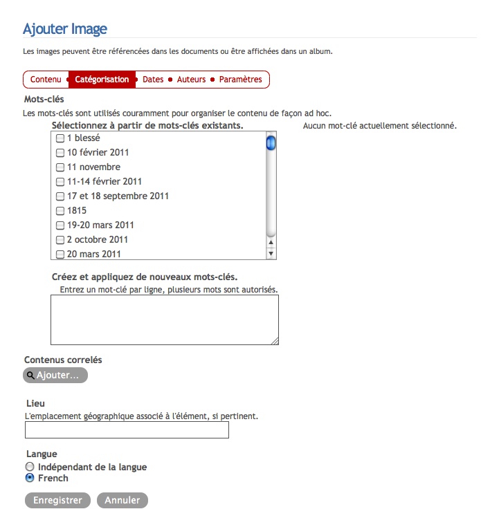 Page de catégorisation pendant l'intégration d'un fichier dans waldighoffen.com pour le choix des mots-clé et des liens corrélés.