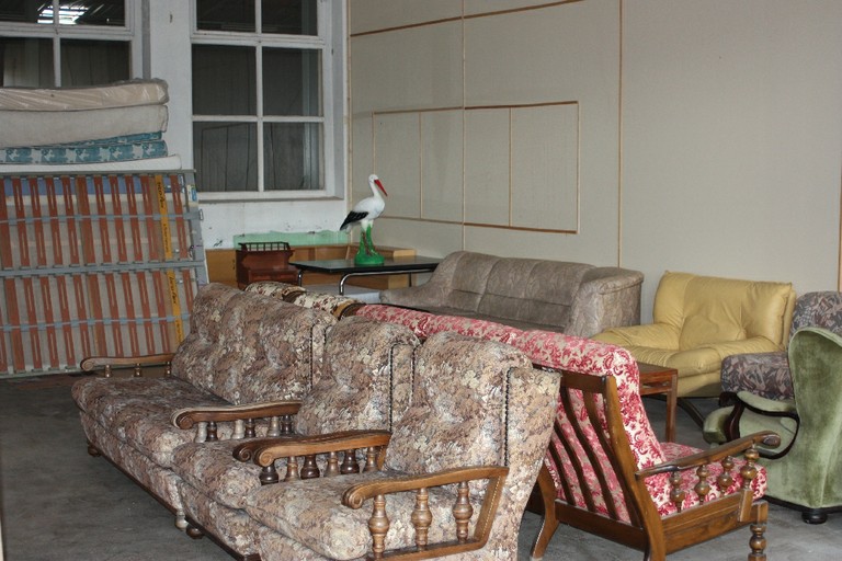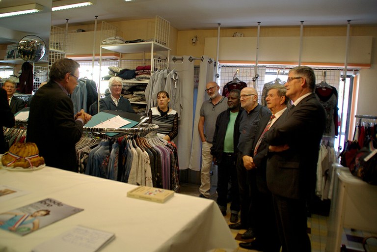 - Image représentant un groupe de personnes, un camion de ramassage, des vêtements et le centre de tri des vêtements collectés.