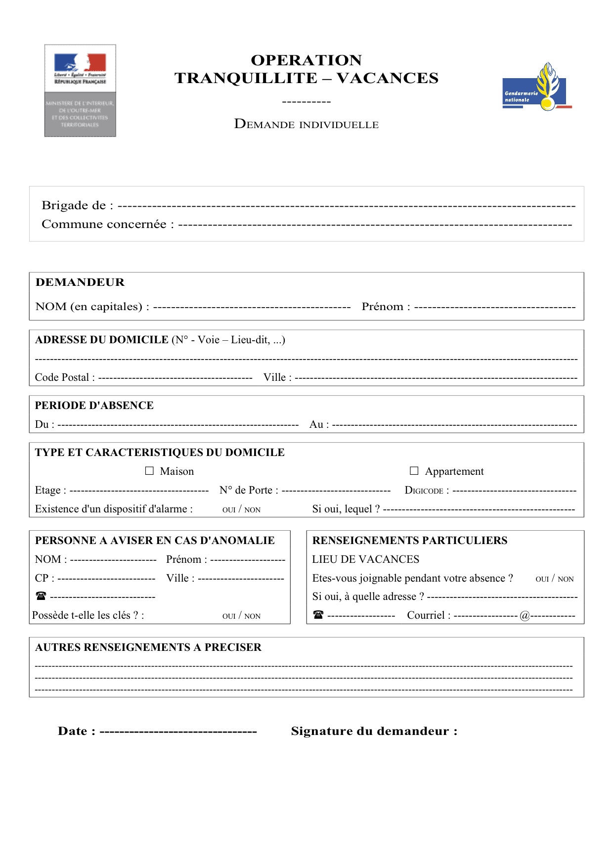 Formulaire de demande individuelle pour l'opération "Tranquillité vacances" lancée par les gendarmeries pendant les vacances scolaires.