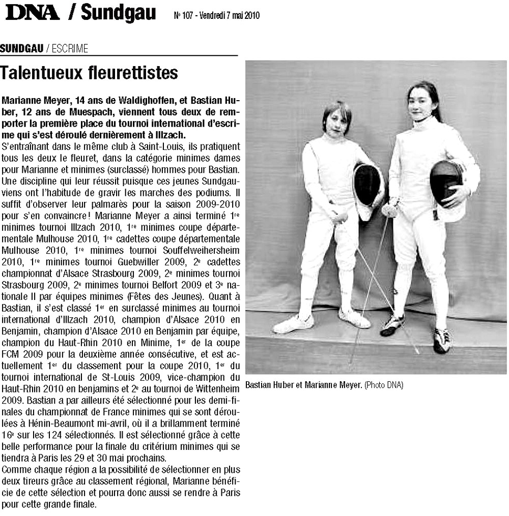 Un article des DNA où est mise à l'honneur une jeune habitante de Waldighoffen pour ses talents de fleurettiste.