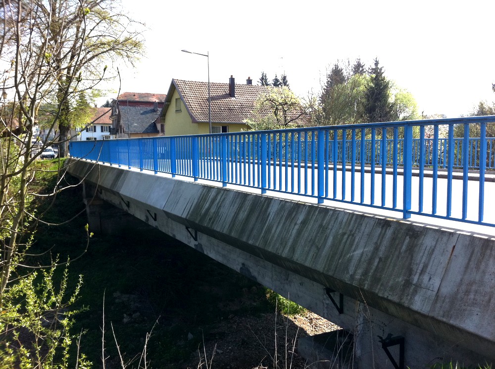 Le pont Jean de Loisy vu des berges dans la rue du 19 novembre à Waldighoffen réparé après l'accident de novembre 2010.