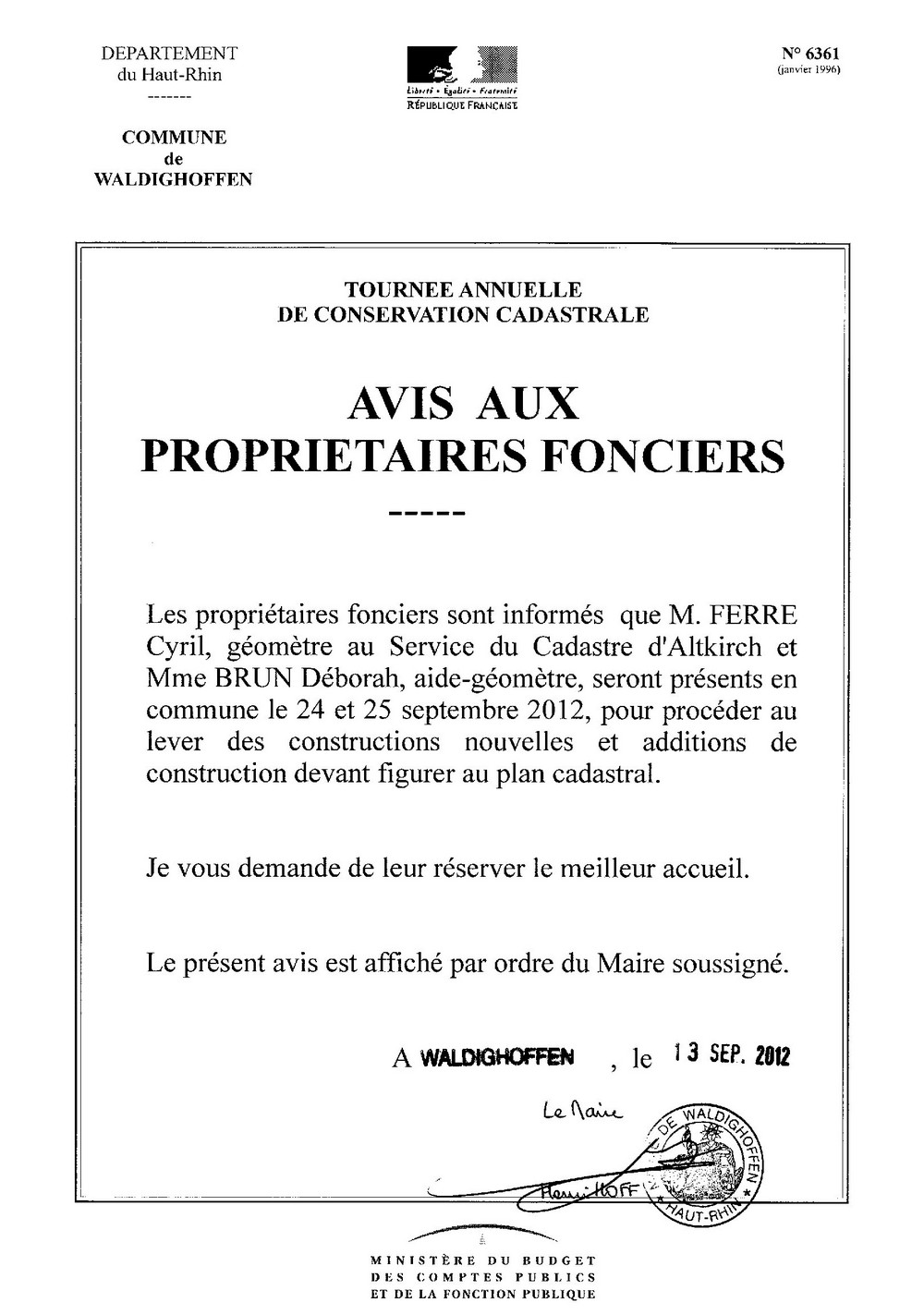 Vous êtes ici : Accueil Photographies et documents annexes Waldighoffen Images et photos Avis de tournée annuelle de conservation cadastrale 2012