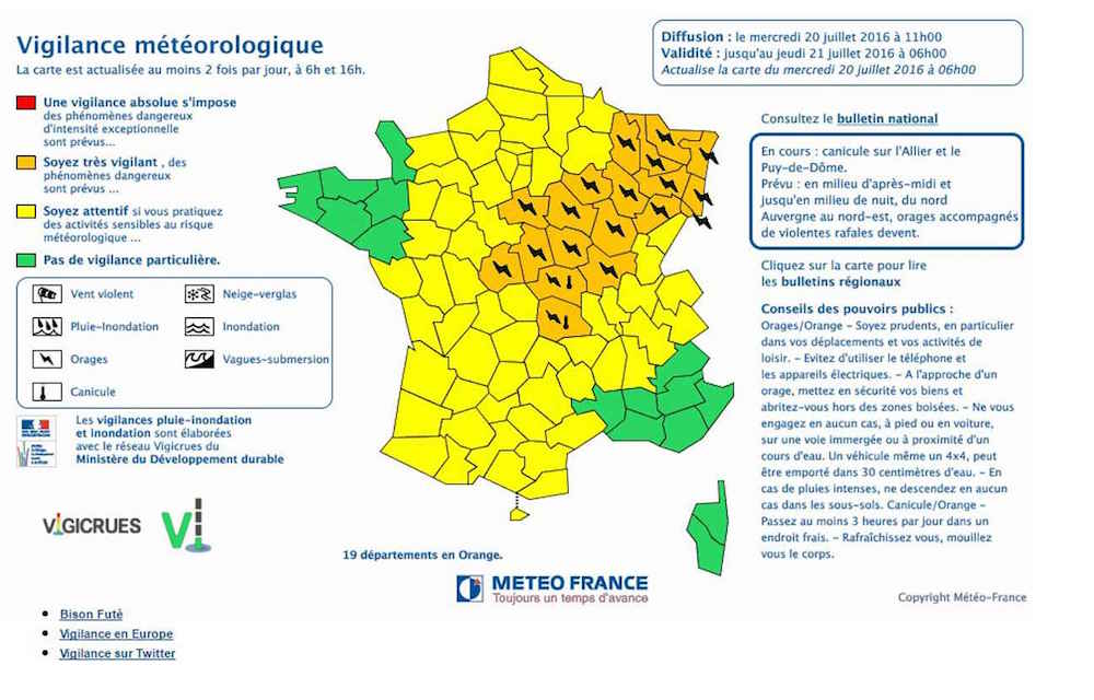carte météo france vigilance orange orage 20 juillet 2016