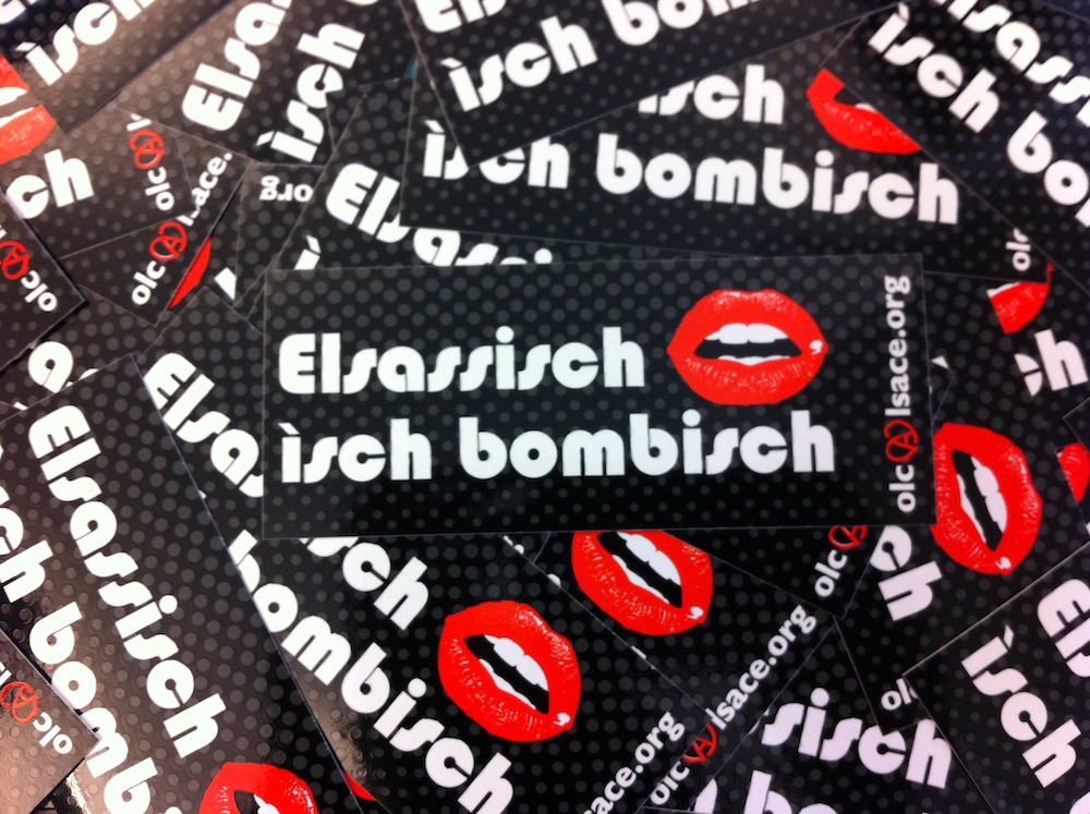 Des dizaines d'autocollants de l'OLCA "Elsassisch isch bombisch" forment un tapis pèle mèle pour faire une jolie mise en valeur de la photo.
