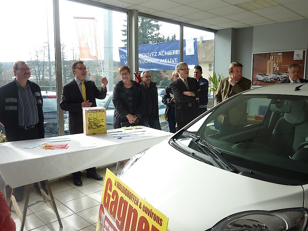 Remise de la voiture de l'opération de Noël 2013 de l'Acaw au garage Wiss, en présence de la gagnante et de nombreux invités