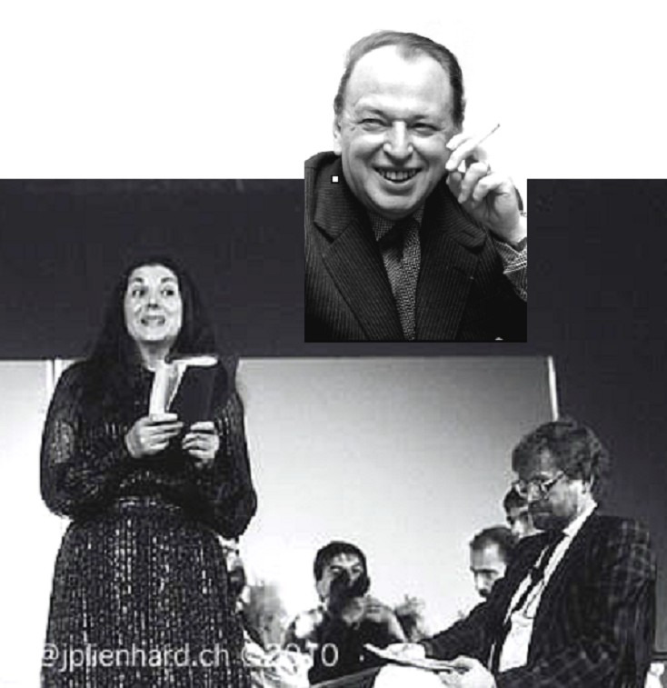 Montage d'une photo d'Yvonne GUNKEL lisant un poème de Nathan Katz et Jürg-Peter LINHARD et d'une photo de Germain MULLER