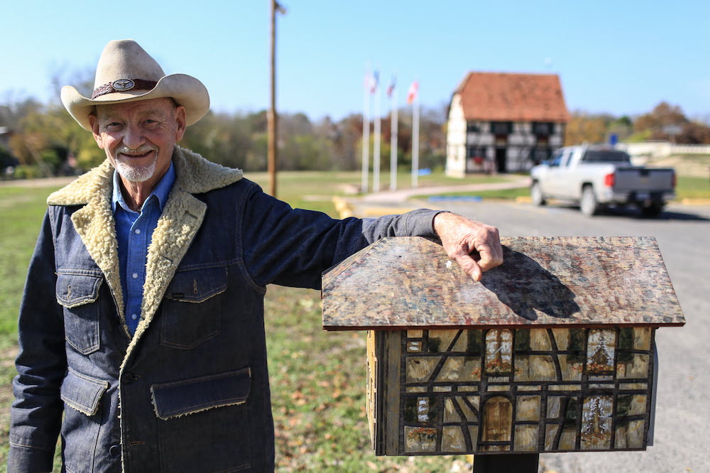 Justin Jungmann accoudé a une boite à lettre en forme de maison Alsacienne à Castroville. Photo L'Alsace, Michel Allemann.