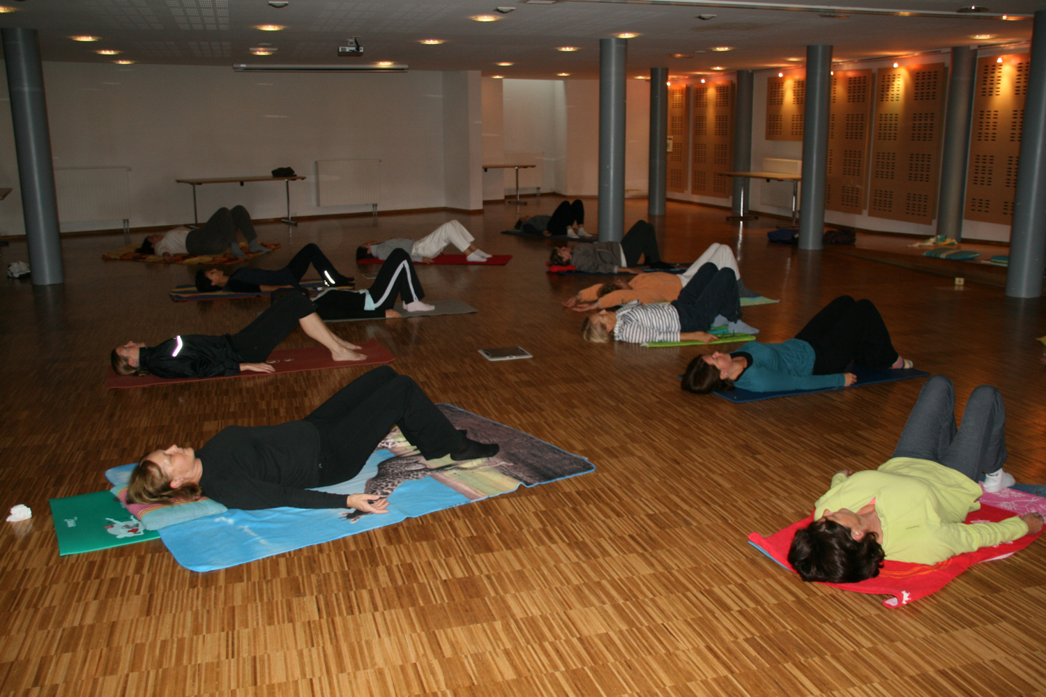 Photo d'un cours de yoga montrant les participantes en pleine relaxation.