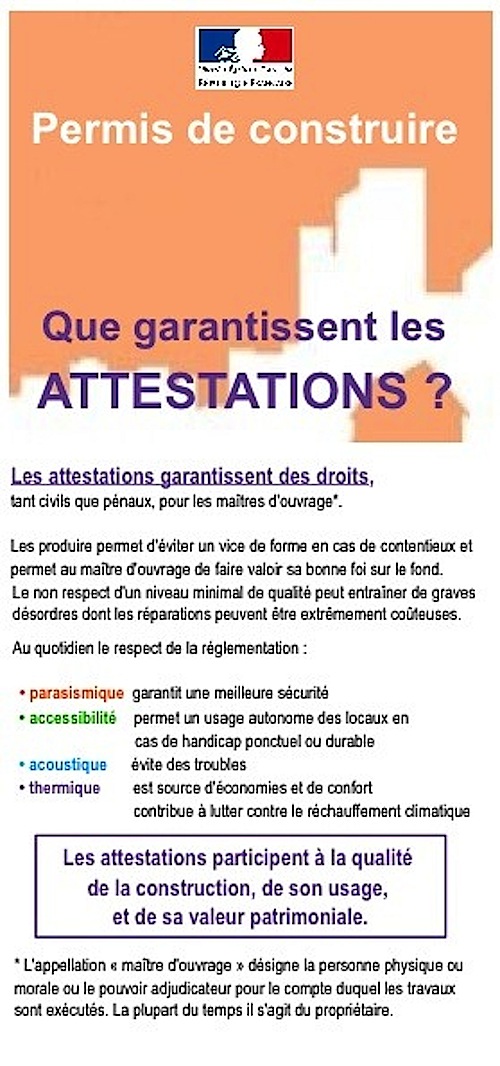 Page 1 du dépliant sur les permis de construire "Que garantissent les attestations"