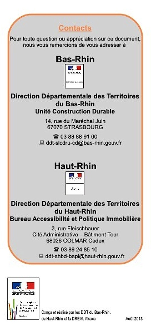 Page contacts pour le Bas-Rhin et Haut-Rhin du dépliant sur les permis de construire "Que garantissent les attestations"