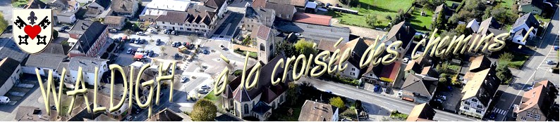 Image sur la première page des bulletins courts de la Commune de Waldighoffen "WALDIGH...à la croisée des chemins". Titre sur fond de vue aérienne du centre du village.