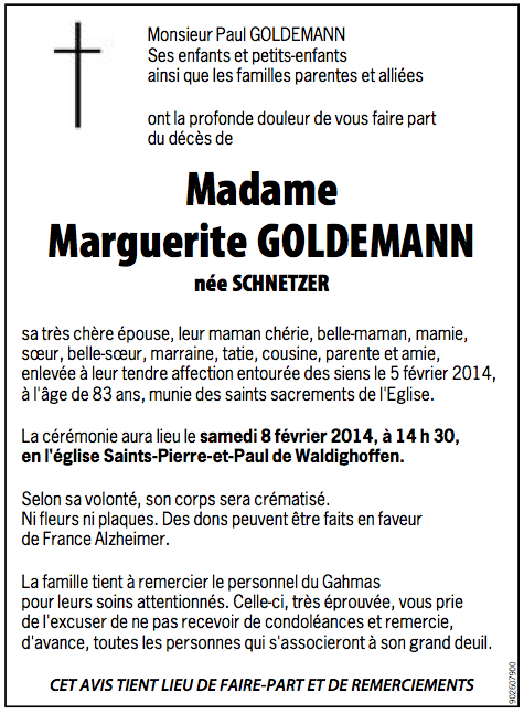 Annonce mortuaire pour Mme Goldemann Marguerite le 5 février 2014.