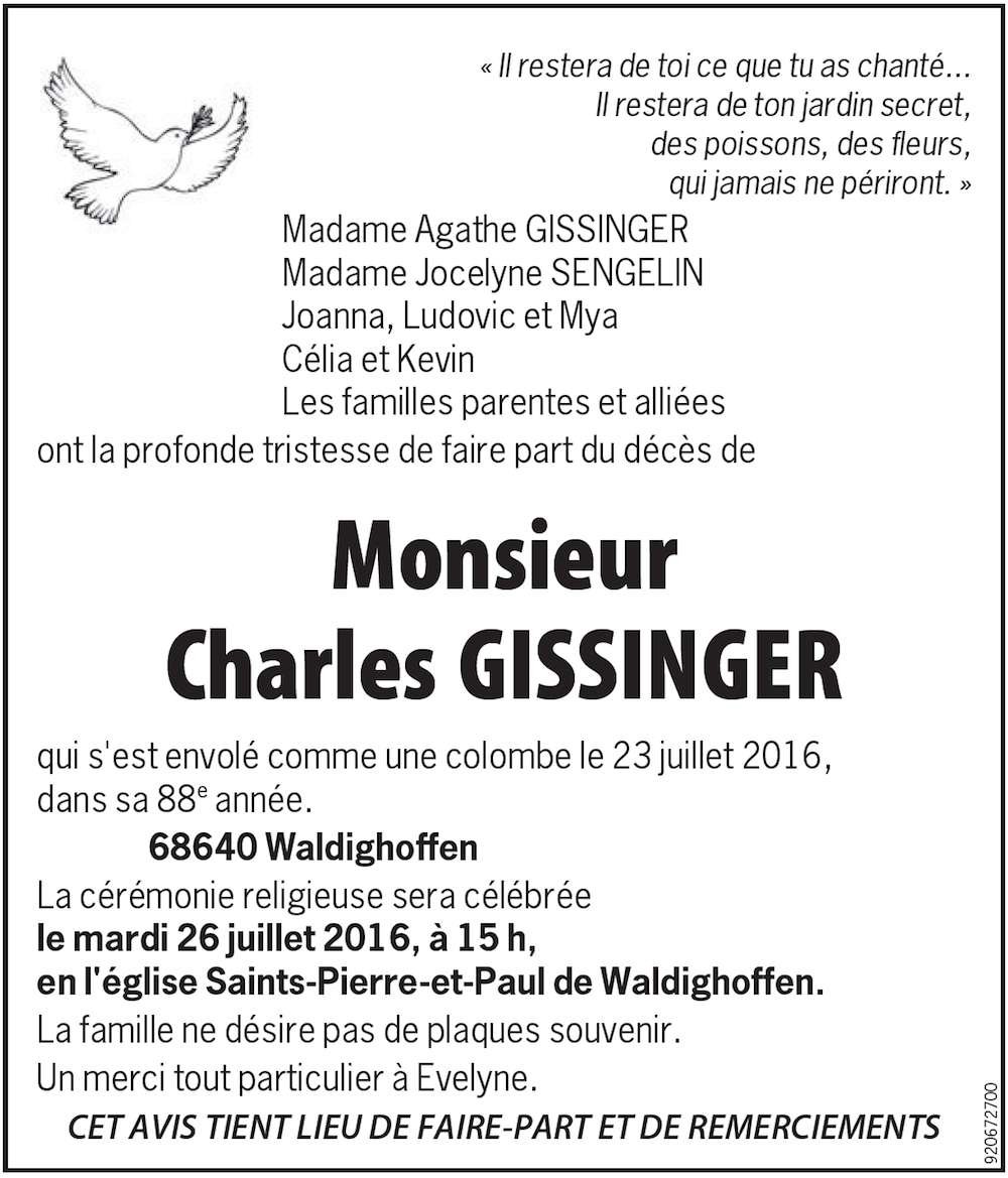 Vous êtes ici : Accueil Au fil du temps… Annexes, documents Au fil du Temps Faire part de la famille décès Charles Gisssinger