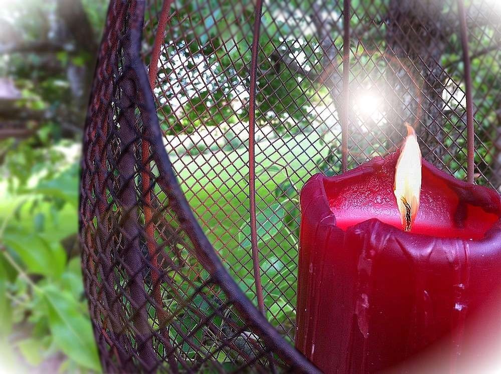 Photophore en fer rouillé accroché à un arbre, avec une bougie allumée. Pour la rubrique des anniversaires