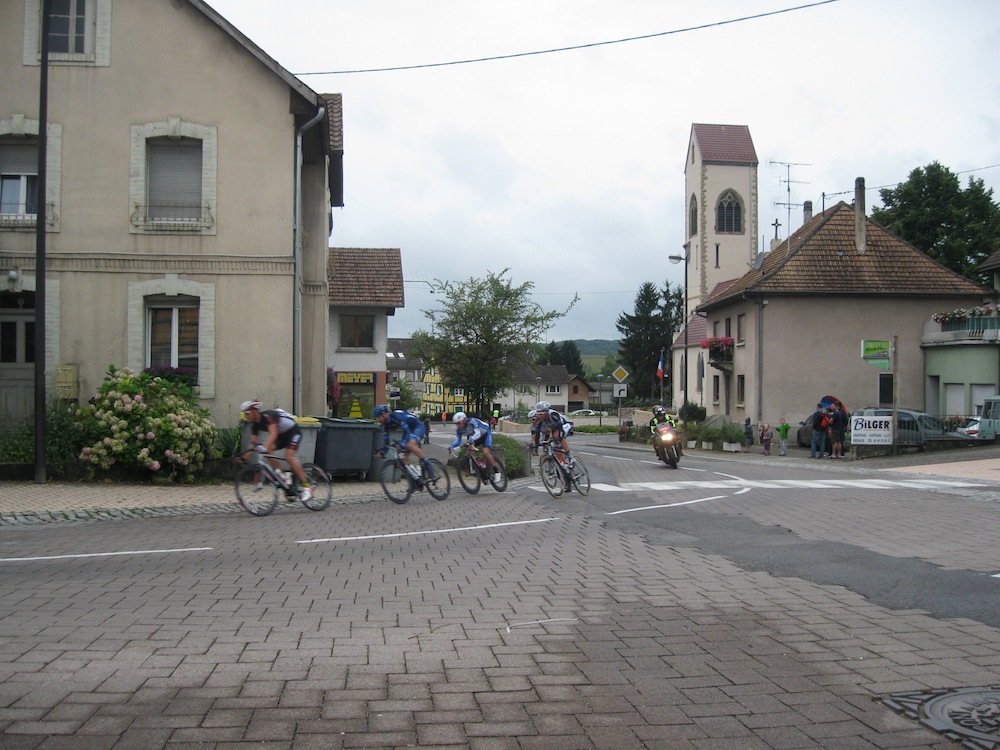 Les premiers coureurs cyclistes qui traversent Waldighoffen pendant le Tour d'Alsace 2014.