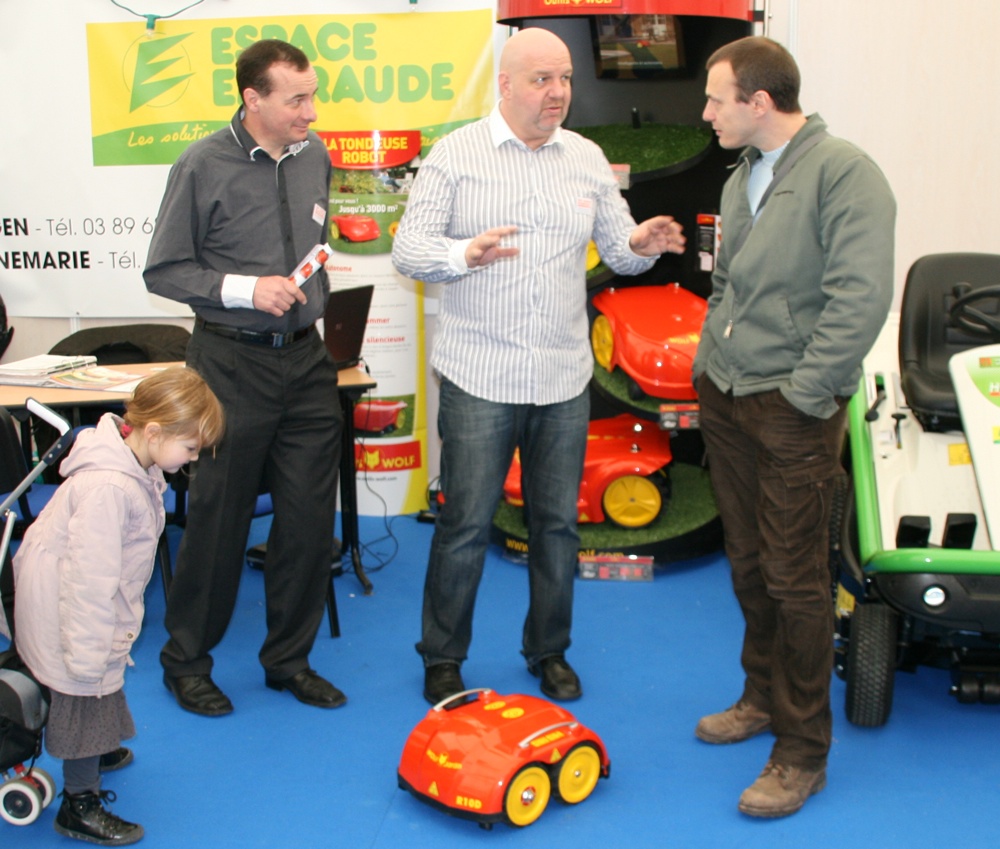 - Voici un stand de vente de tondeuses à gazon. Le petit modèle en démonstration qui se trouve au sol tond toute seule votre gazon ! Expo-Habitat 2011 de Waldighoffen.