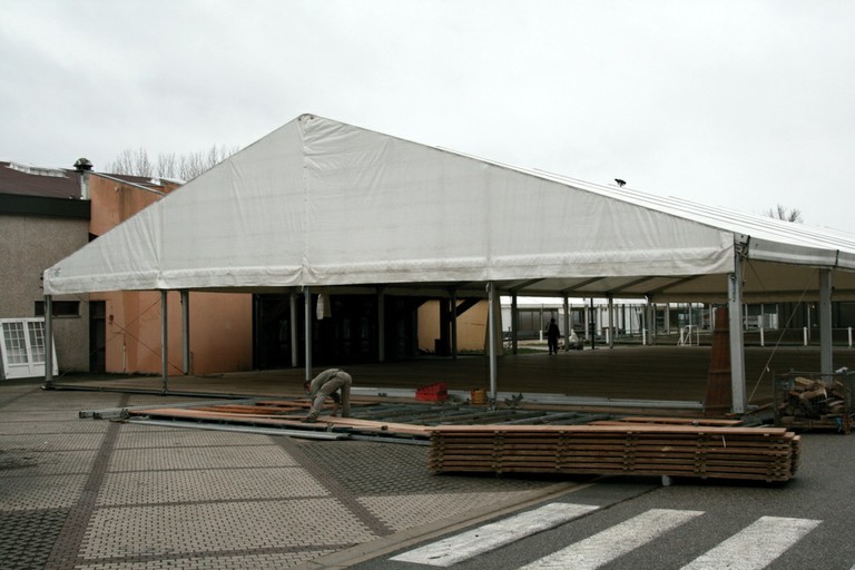- Mise en place par les ouvriers du plancher des tentes qui accueilleront l'Expo Habitat 2011 de Waldighoffen.