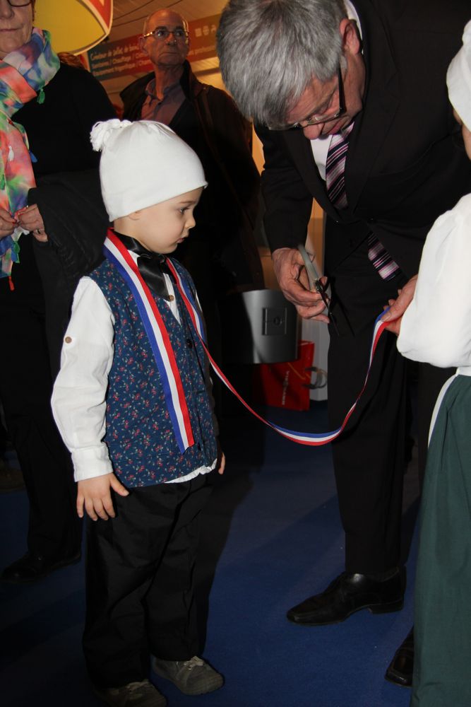 Lucas, petit sundgauvien, partage son long ruban tricolore avec M. le Maire, lors de l'inauguration de la 31ème Expo Habitat de Waldighoffen.