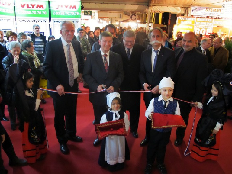- Fernand Heinis entouré d'élus et des petits alsacien pour le couper du ruban de la 32ème inauguration du salon Expo Habitat de Waldighoffen.