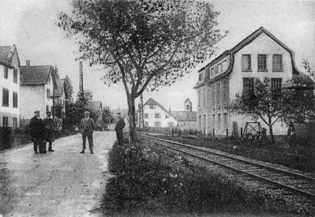 Vue de la centrale électrique rue de la République, les rails se trouvant entre la centrale et la rue; en arrière-plan le restaurant Schielin, l'église plus loin, et la cheminée de l'usine Lang.