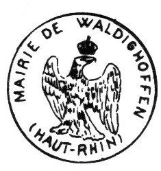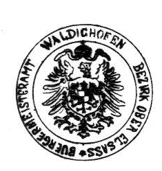 - Le tampon est rond, il contient en son centre l'aigle allemand et le texte "Burgermeisteramt Waldighofen Bezirk Ober-Elsass"
