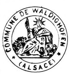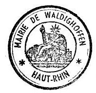 - C'est un tampon rond avec le texte écrit en gothique :"Gemeinde Waldighofen", sans dessin.