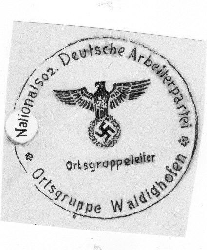 - Ce tampon contient au centre l'aigle du Reich qui tient une couronne de lauriers avec la croix gammée accompagné du mot "Ortsgruppeleiter". Tout autour, on lit le texte suivant : "Nationalsoz. Deutsche Arbeiterpartei - Ortsgruppe Waldighofen"