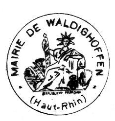 Tampon de la Mairie de Waldighoffen (Haut-Rhin) en 1945. La justice au centre, le texte Mairie de WALDIGHOFFEN (Haut-Rhin) autour, avec deux F pour Waldighoffen