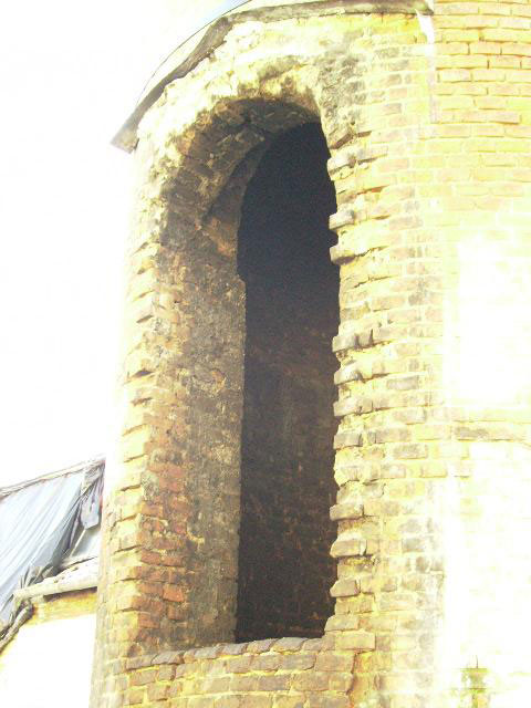 Cette photo montre, par une ouverture dans celle-ci, l'épaisseur de la paroi de la cheminée de l'usine Lang.