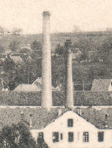 Zoom sur les deux cheminées de l'usine Lang, avant la démolition en 1892 de l'ancienne cheminée. Collection photos René Minéry.
