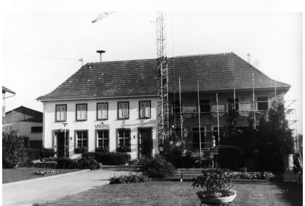 Photo des travaux d'agrandissement de la Mairie en 1970-71. La partie Poste est sous les échaffaudages.