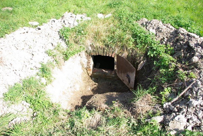 Photo de la chambre intermédiaire du "Burnstube" avant travaux, porte métallique ouverte