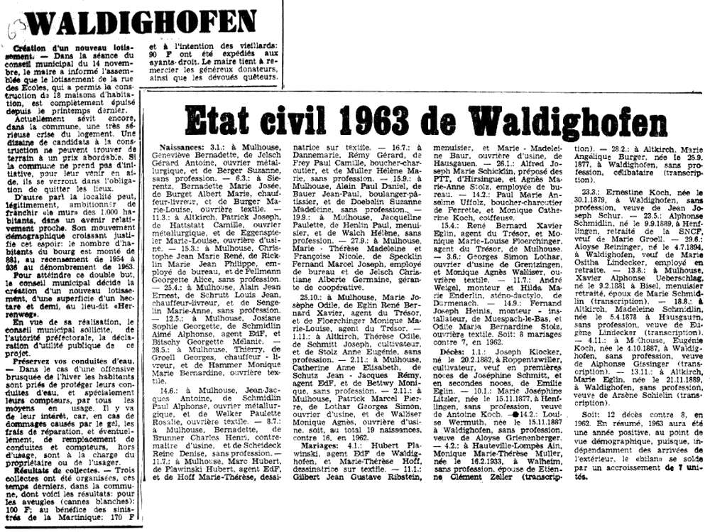 Cet extrait de presse comporte l'état civil de 1963, la création d'un lotissement, des conseils sur les conduites d'eau et des résultats de collectes.