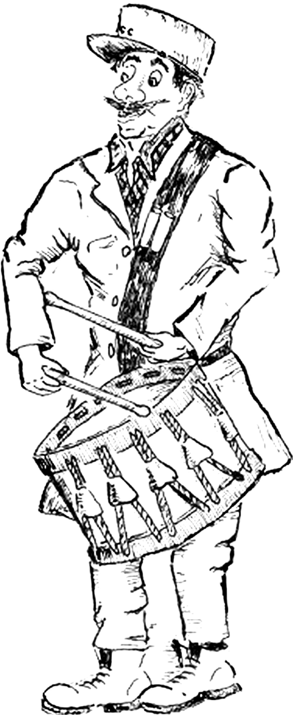 Dessin d'un garde champêtre avec sa moustache, son tambour et son képi