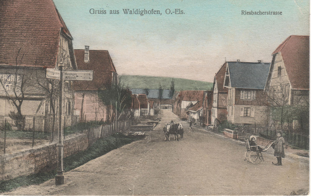 Photo montrant l'actuelle rue du 19 Novembre (rue de Riespach) depuis le centre du village vers le pont de l'Ill.