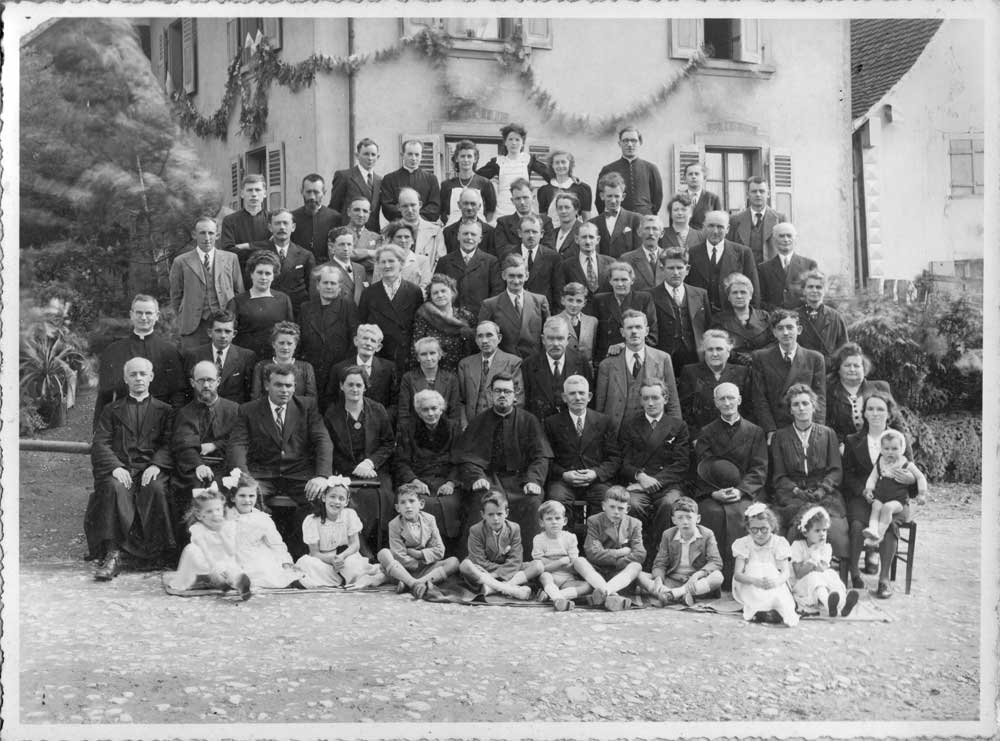 Les invités du Père Aloyse Grienenberger le jour de sa première messe, le 18 juillet 1948, devant la maison paternelle.