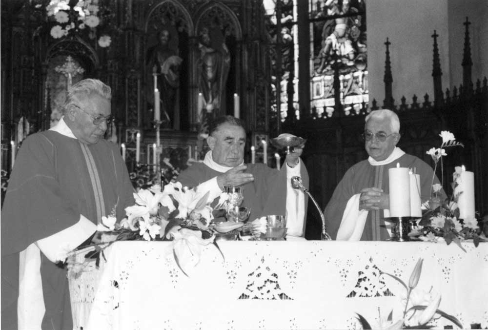 Vue des trois prêtres fêtant, à l'autel, leur jubilé sacerdotal de 60 ans de prêtrise, le 6 juillet 2008. De gauche à droite, l'abbé Joseph Henlin, l'abbé Antoine Ditner et le père Aloyse Grienenberger.