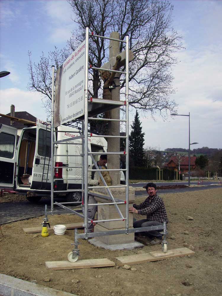 Travail du tailleur de pierre Hubert Gardère pour la réfection du calvaire à l'angle de la rue du 19 Novembre et de la rue des Perdrix.