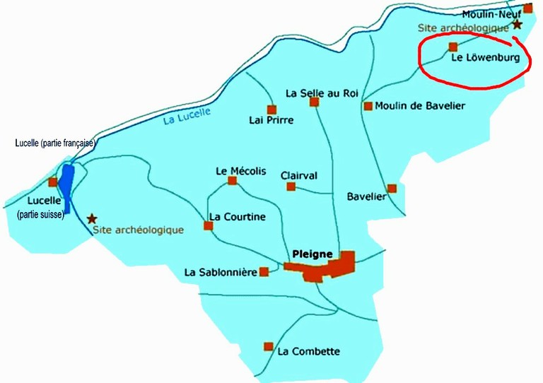 - Carte trouvée sur le site de la commune de Pleigne permettant de situer le Löwenburg, Pleigne, le Moulin Neuf et Lucelle du côté suisse avec son lac et du côté français.