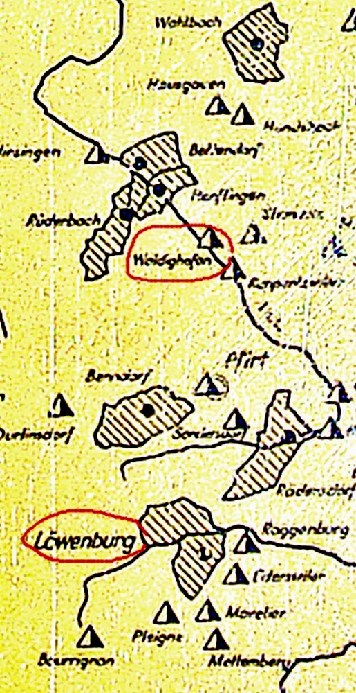 Carte du Löwenburg et du Sundgau (Entourés de rouge Waldighoffen et Löwenburg)