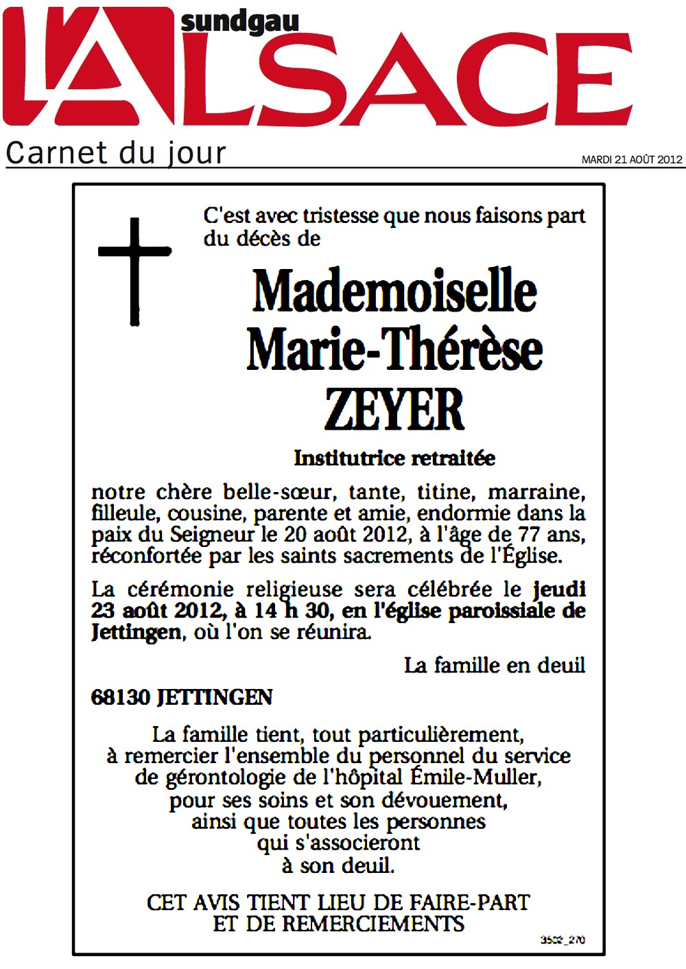 L'avis de décès paru le 21 août 2012 dans le journal L'Alsace pour annoncer la disparition de Mademoiselle ZEYER Marie-Thérèse.