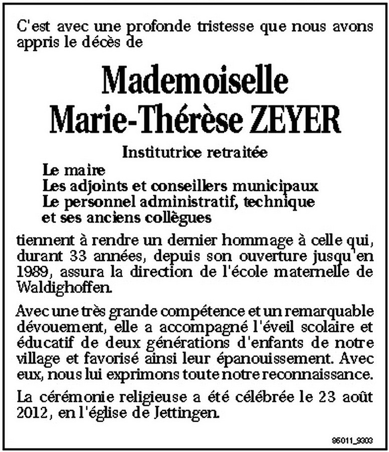 Avis décès Melle Zeyer par la commune de Waldighoffen