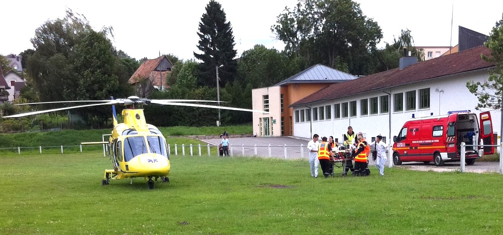 L'ambulance des pompiers amène le blessé vers l'hélicoptère du Samu