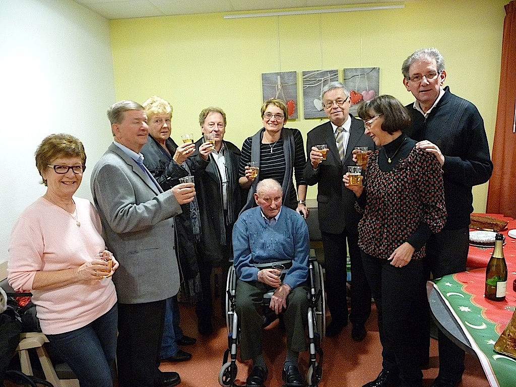Evelyne Herrmann, Jean-Claude Schielin; Ursule et Guy Eggenspieler, Thérèse Schmitt, Henri Hoff, Paul Kueny et son épouse entourent Albert.