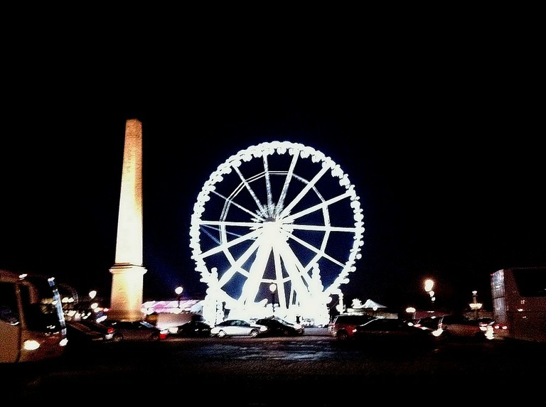 - Dans la nuit d'hiver, la grande roue se dresse au bord de la place de la Concorde à Paris