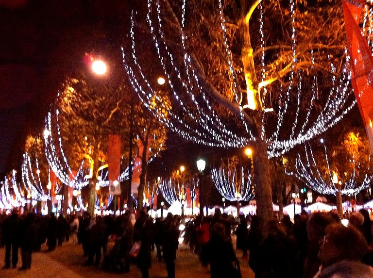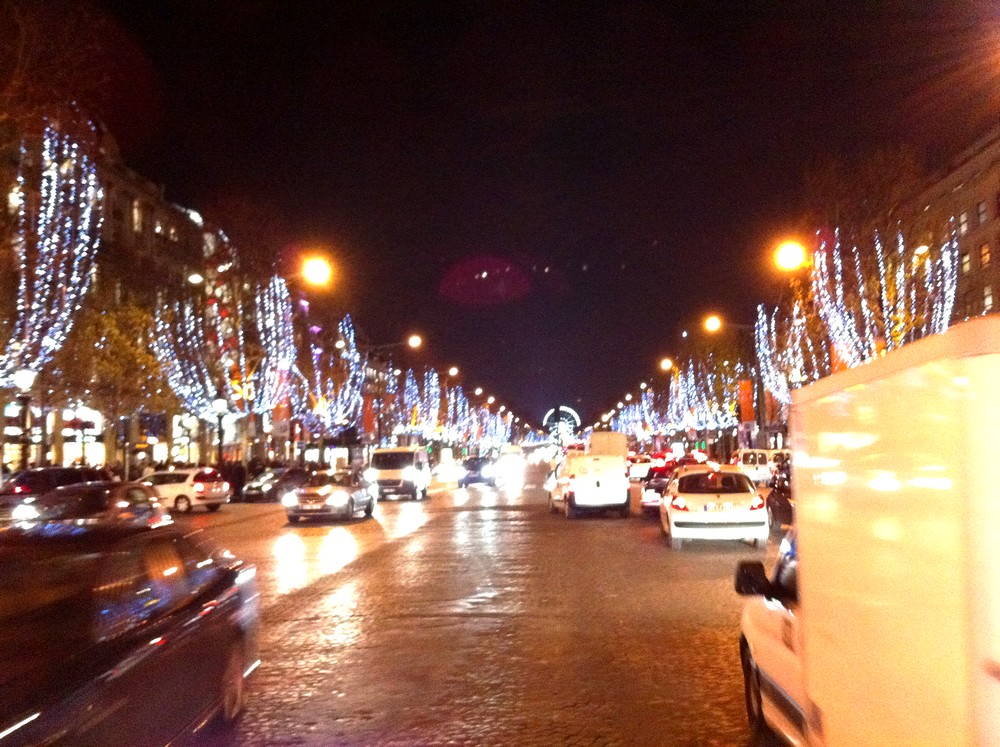 - Au fond, les cabanes illuminées du marché de Noël (entre la place de la Concorde et le Rond-point des Champs Elysées)